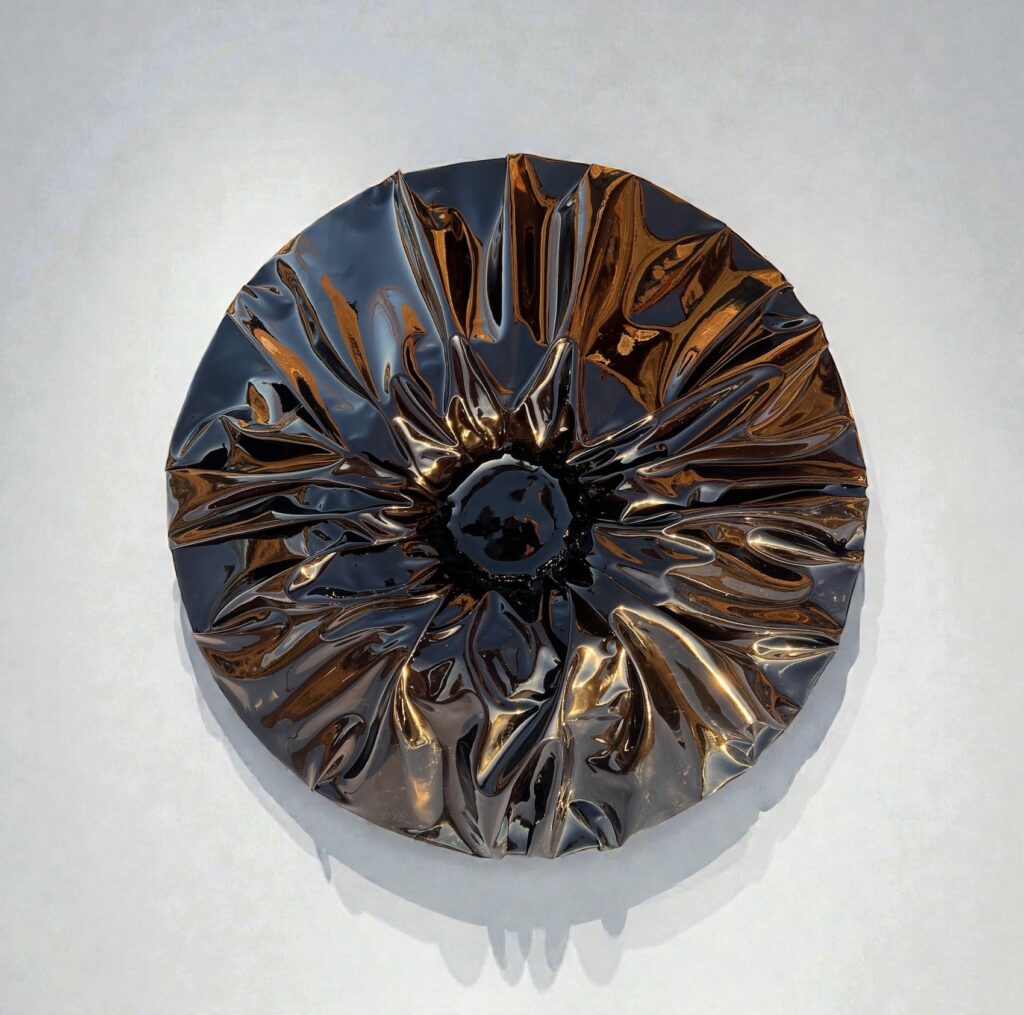 Black Circle (The Indentations), 2025, 33"L x 33"H x 7"D, black colored mirror chrome vinyl on panel