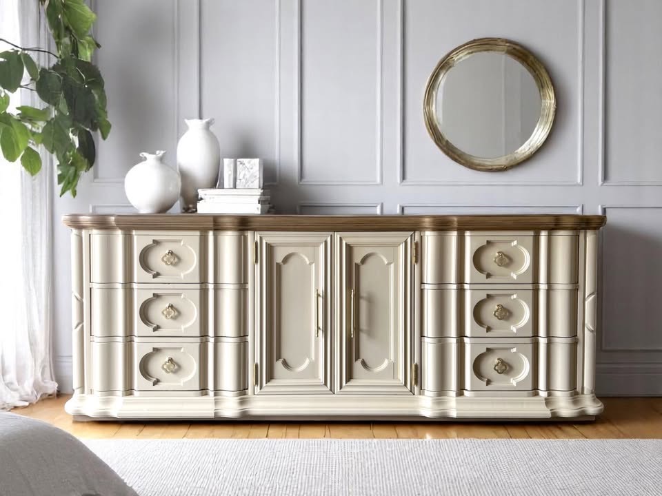 This stunning **vintage solid wood dresser** was custom made for Levitz by **Thomasville Furniture Industries**βa true blend of timeless craftsmanship and updated style.